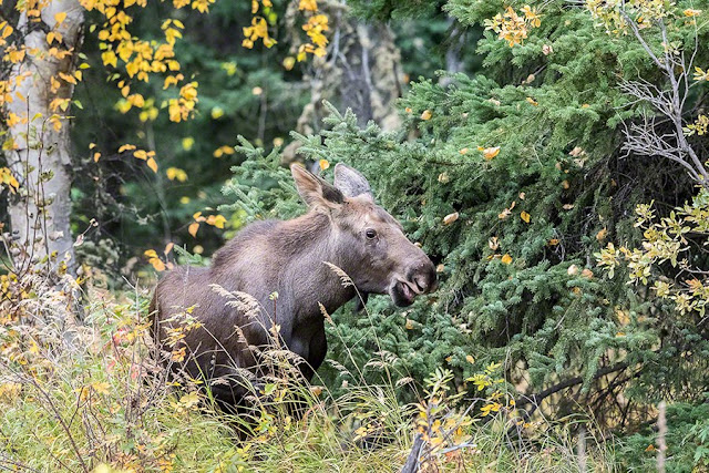 We had a long drive today from Denali through Fairbanks to Tok. Until now we've avoided driving when it is getting dark so we have a better chance of seeing animals on the road. Just before reaching Fairbanks, we saw a female moose roadside so we stopped to watch. She looked like she was going to disappear back into the trees, but instead she brought out her two young ones and they all ran across the road in front of us to get to tastier greenery.