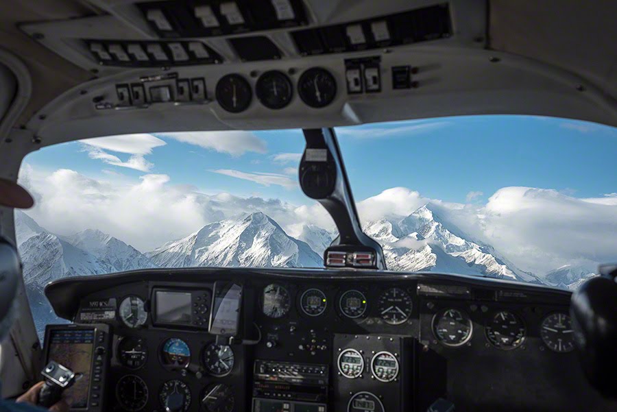 After checking out of the Dome Home in Healy, we quickly drove to Denali Air. They were able to fit us in to the first flight of the day. The day was mostly clear but the the ride was oh so turbulent. I was sitting on the right side of the plane, but the pilot seemed to favor the left side (Dan's side). He dipped his wing to give Dan the postcard view of Denali, but did not offer the same view on my side. I finally took a photo of Denali through the windshield to make sure that I had one.
